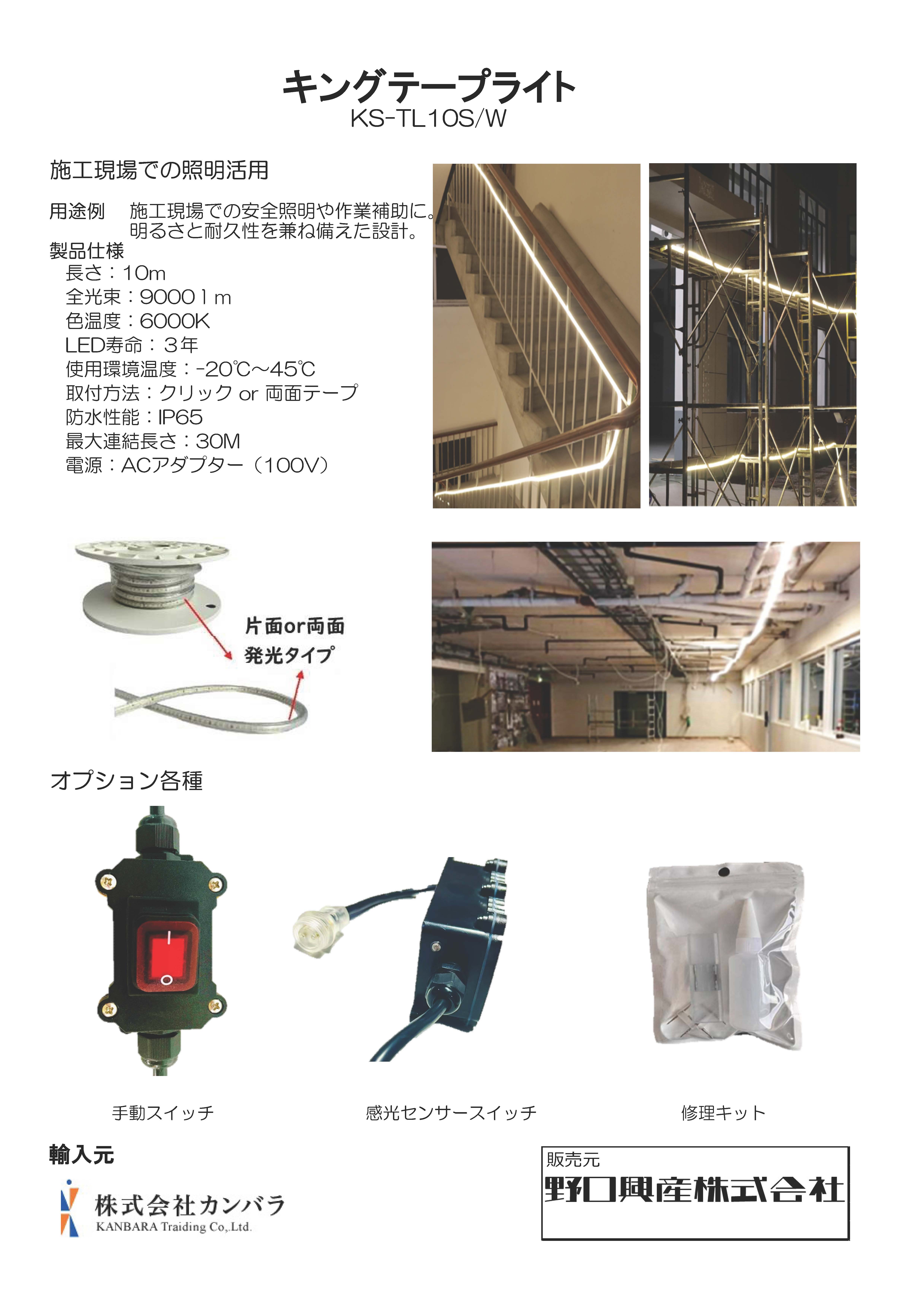 【新製品のご紹介】キングテープライト ニュース < 前のお知らせ 次のお知らせ > 日付 2025/11/13 内容 株式会社カンバラ様より施工現場での照明で活用できる新製品 キングテープライトのご紹介です。発売は12月となります。※詳細な発売日が決まり次第、改めて本ページにてご案内させていただきます。冬至が近づくにつれ日が短くなり、現場作業を出来る時間がだんだん限られてくる中で、施工現場での安全照明や作業補助に使用できます!また、LEDを使用しているため長寿命(3年)、省エネルギーとなっております。長さ:10m/巻出荷単位:10巻※オプション各種は1個単位で出荷可能ご興味がありましたら、ぜひ弊社営業までお問い合わせください。 添付ファイルダウンロード ファイルをダウンロード 【チラシ】テープライト.pdf < 前のお知らせ 次のお知らせ >