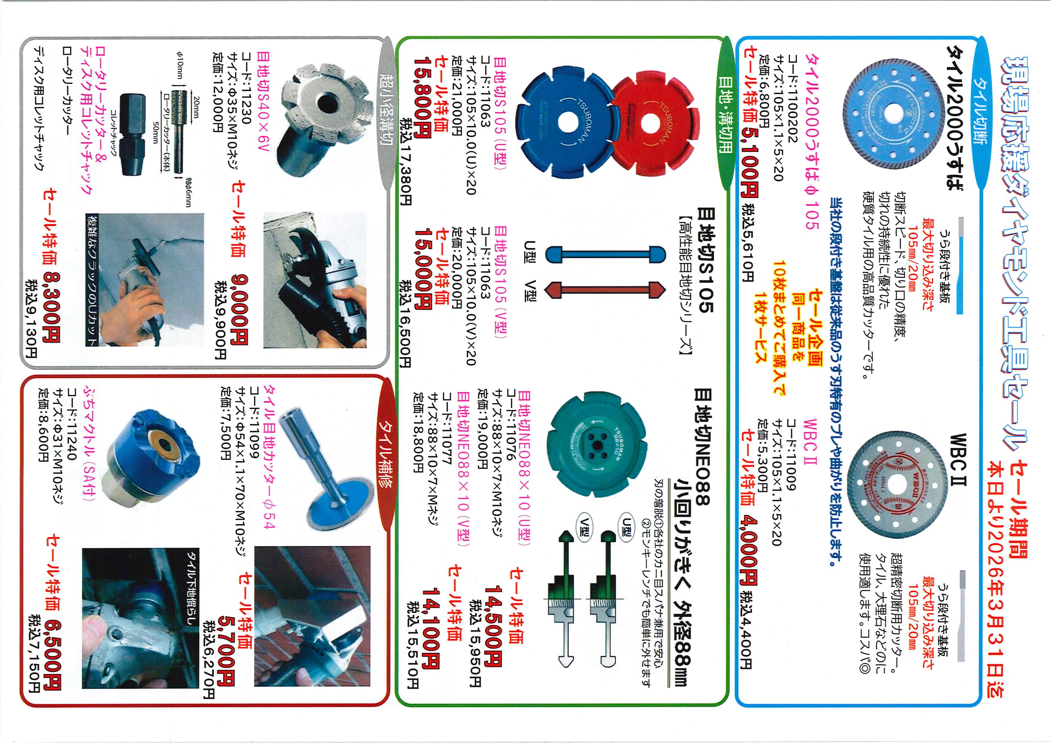 【セール】ツボ万 現場応援ダイヤモンド工具セール ニュース < 前のお知らせ 次のお知らせ > 日付 2026/01/21 内容 株式会社ツボ万様より現場応援ダイヤモンド工具セールのお知らせです。セール期間:2026年3月31日(火)までチラシに掲載されている商品がセール特価や10枚注文で1枚サービスなどお得なセールとなっております。掲載の画像以外にも対象商品がございますので、ぜひ添付のチラシをご覧ください。製品の詳細や価格等につきましては、弊社営業までお問い合わせください。 添付ファイルダウンロード ファイルをダウンロード ツボ万 現場応援ダイヤモンド工具セール.pdf < 前のお知らせ 次のお知らせ >